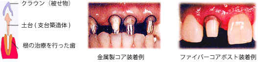 保険の治療では、むし歯によって大きく形が変わった歯に、土台として銀合金のメタルコアを使い、クラウン(被せ物)をするための形に修復しますが、これは金属が錆びて溶け出しやすく、二次的なむし歯、歯や歯肉の変色、金属アレルギーなどを引き起こす可能性があります。また、この銀合金のメタルコア自体が折れてしまったり、金属の「くさび効果」のために根管が割れてしまい、歯を抜かなければならないこともあります。